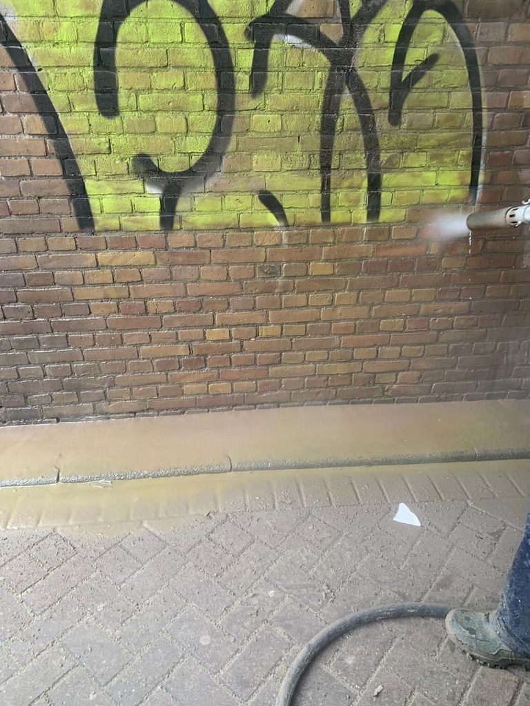 Voor het verwijderen van graffiti gebruiken we het TORBO systeem. Dit is een straalsysteem dat drie elementen combineert: water, lucht en een straalmiddel dat is afgestemd op het oppervlak dat gereinigd wordt. Denk bijvoorbeeld aan Olivinezand voor harde baksteen of glasparels voor zacht natuursteen. Zo kunnen we maatwerk leveren, het maakt niet uit op welk materiaal de graffiti is aangebracht.