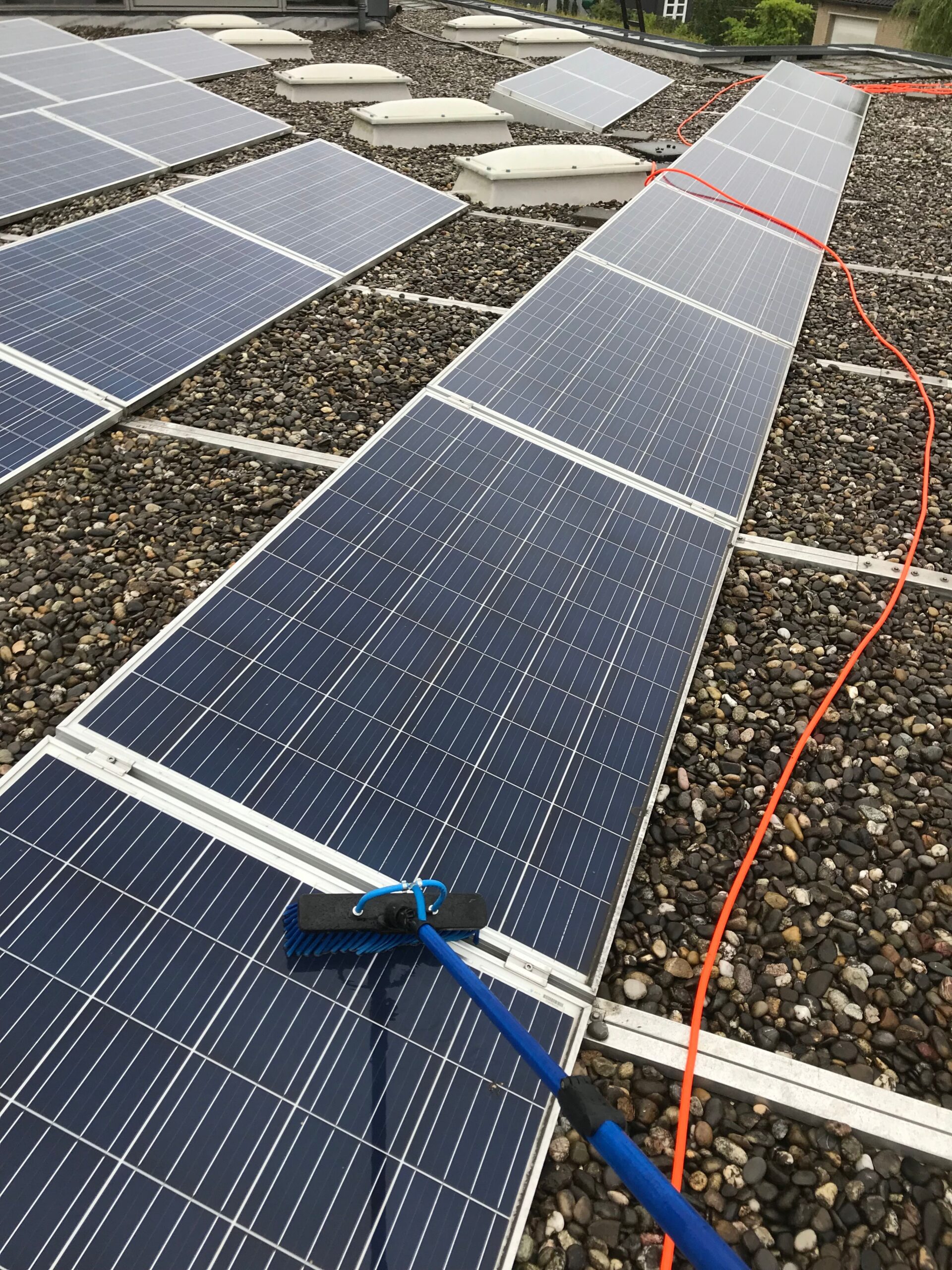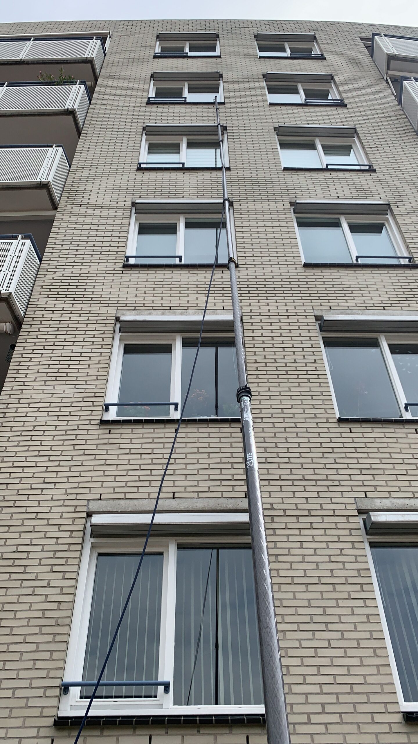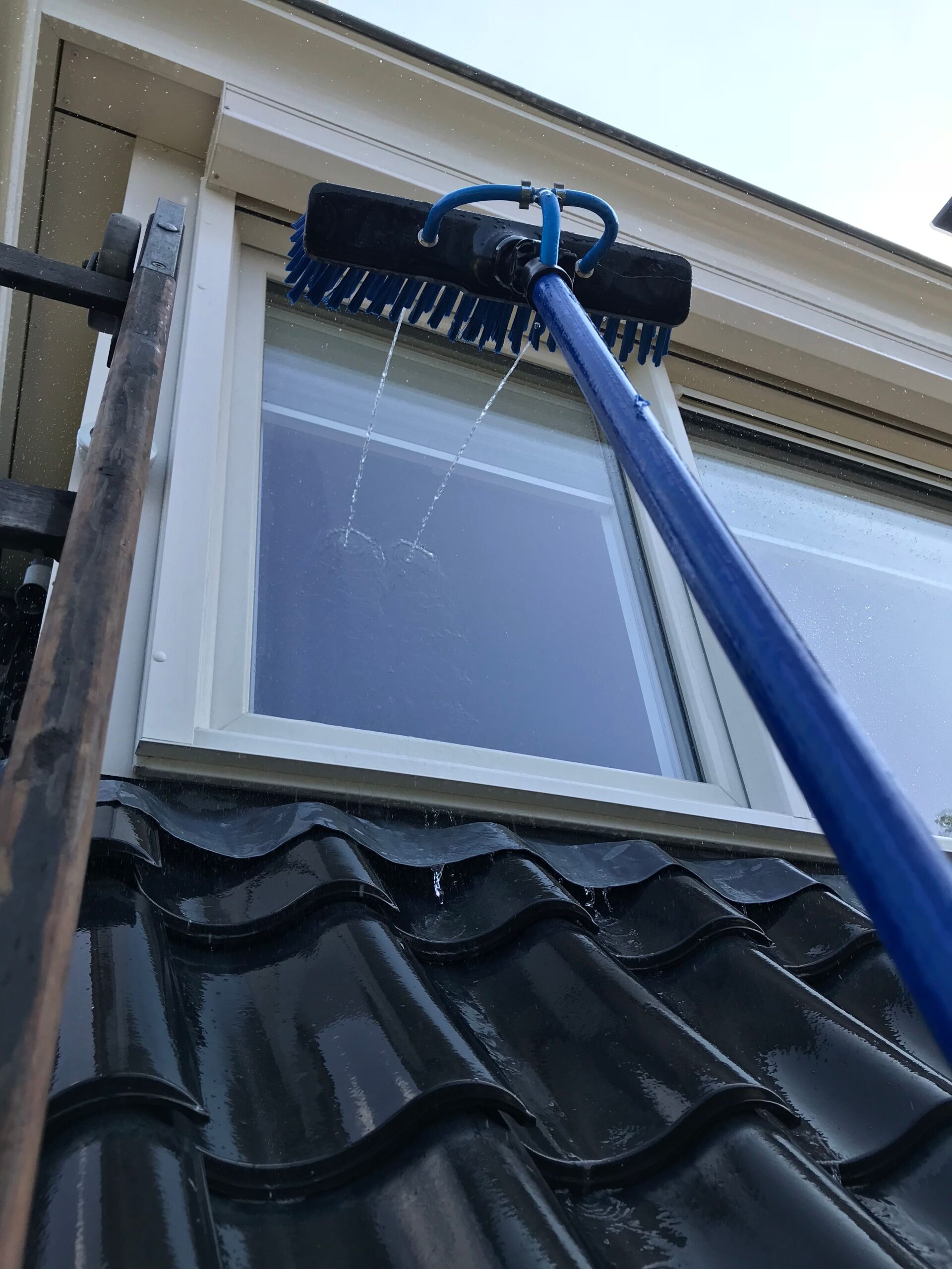 Het telescopisch bewassen en borstelen van de ramen en kozijnen met osmose water op grotere hoogte. Werkt streeploos zonder de ramen te wissen.
